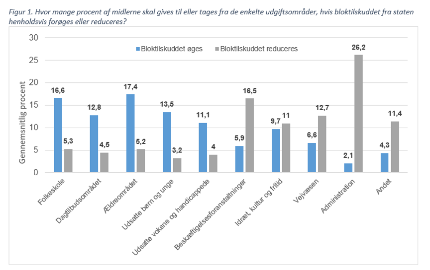 VIVE har op til dette års kommunalvalg og de to seneste før det spurgt lokalpolitikerne om, hvordan de ville prioritere mellem forskellige udgiftsområder, hvis statens bloktilskud til kommunerne blev henholdsvis øget eller beskåret. Her er svaret, at skoler, dagtilbud, ældreområdet og området for udsatte børn og unge bliver prioriteret højest, hvis der bliver flere penge til rådighed: 60 pct. af eventuelle ekstra ressourcer skal ifølge lokalpolitikerne gå til disse fire områder, fordelt med omkring 17 pct. til henholdsvis skoler og ældre og omkring 13 pct. til henholdsvis dagtilbud og udsatte børn/unge. Endelig mener lokalpolitikerne også, at udsatte voksne og handicappede bør tilgodeses med 11 pct.