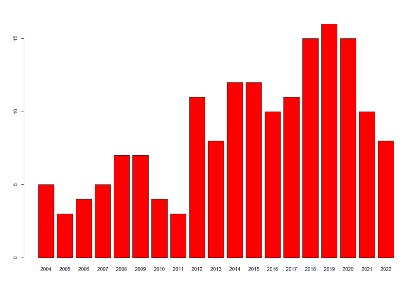 Antal videnskabelige publikationer af forskere med tilknytning til danske forskningsinstitutioner, per år for perioden 2004-2022
