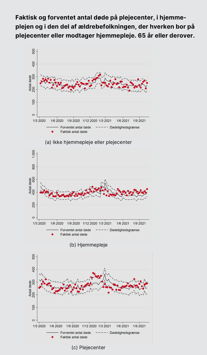 Undersøgelsen består blandt andet af en analyse af, hvorvidt der kan ses en overdødelighed blandt ældre over 65 år, der i) bor på plejecenter, ii) modtager hjemmepleje eller iii) hverken bor på plejecenter eller modtager hjemmepleje. VIVE har undersøgt det ved at sammenligne dødeligheden i undersøgelsesperioden med dødeligheden i tidligere år (2015-2019).