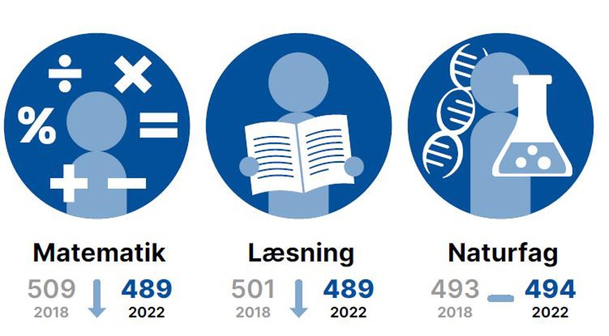 For de danske elever er den gennemsnitlige score i matematik og læsning gået væsentligt ned sammenlignet med seneste PISA-undersøgelse i 2018, mens scoren for naturfag er uændret siden sidst. Trods nedgangen ligger Danmark dog fortsat væsentligt over OECD-gennemsnittet i alle tre fag.